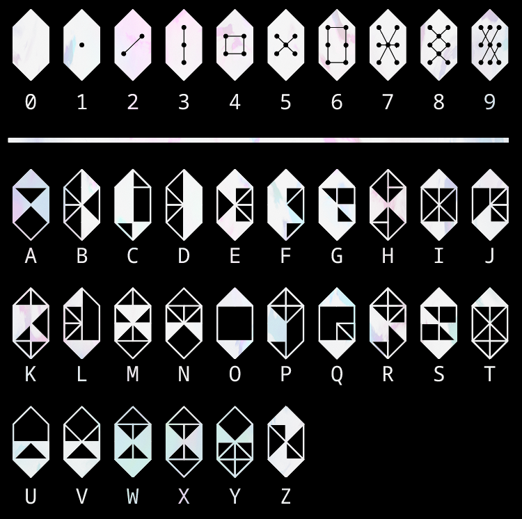 Each character is derived from the digits 0 – 9 and the letters A – Z. The symbols are constructed using tri-state segment displays resembling OpalQuartz ( battery cells used to store ION energy ).